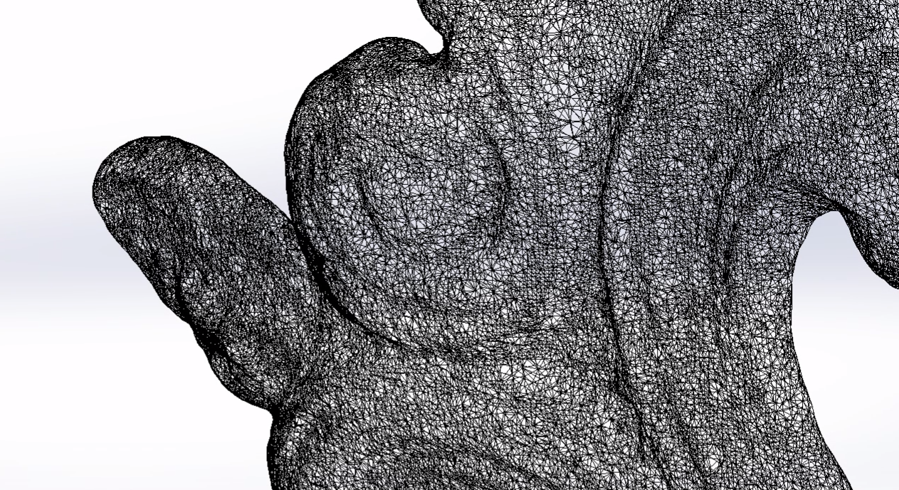 In an extreme closeup wireframe view of the Buddha’s head piece, the sheer density of scan data becomes more apparent.