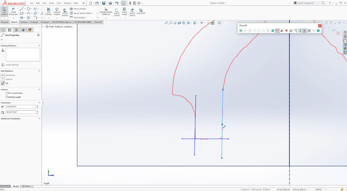 You can hit the Hide Mesh button in the Xtract3D toolbar to focus exclusively on sketching just the red outline. Since the left and right sides are the same, we only need to trace one side of the part. Selecting which side to sketch depends on which one best captures the design intent of the part. We will select the left side since it appears to be cleaner than the one on the right, which indicates that there are less manufactured imperfections or wear and tear.