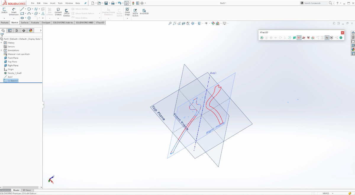 Our center axis is defined by the intersection of our Front and Right planes. To create our solid model, we can simply revolve the sketch around the center axes by using SOLIDWORKS Revolve button.
